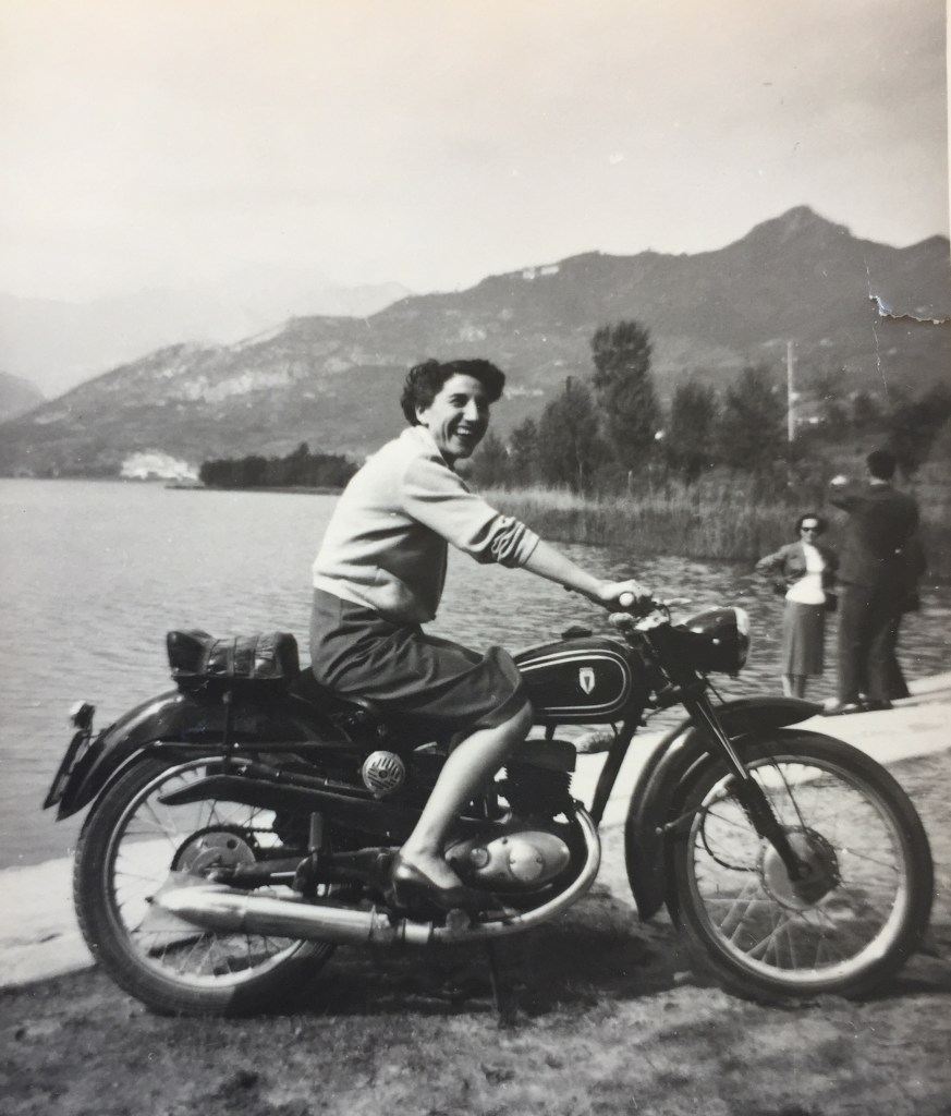 Marta posa per gioco in sella ad una moto, sulle rive del Lago di Annone