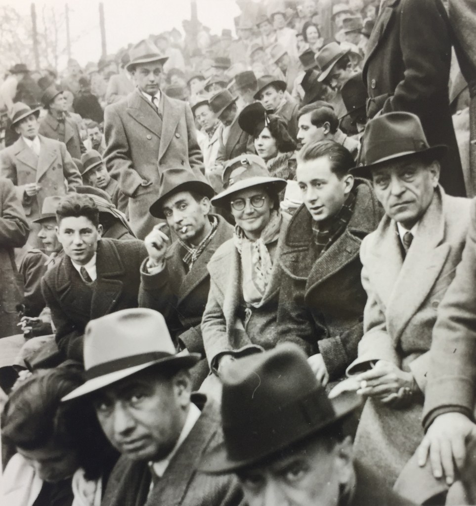 Giacomo Barcellona, Mario Boccalini, Giovanna Boccalini Barcellona e Rino Bordoni sugli spalti dell’Arena Civica di Milano, per assistere alla partita Ambrosiana-Inter – Juventus (risultato finale: 2 – 1).