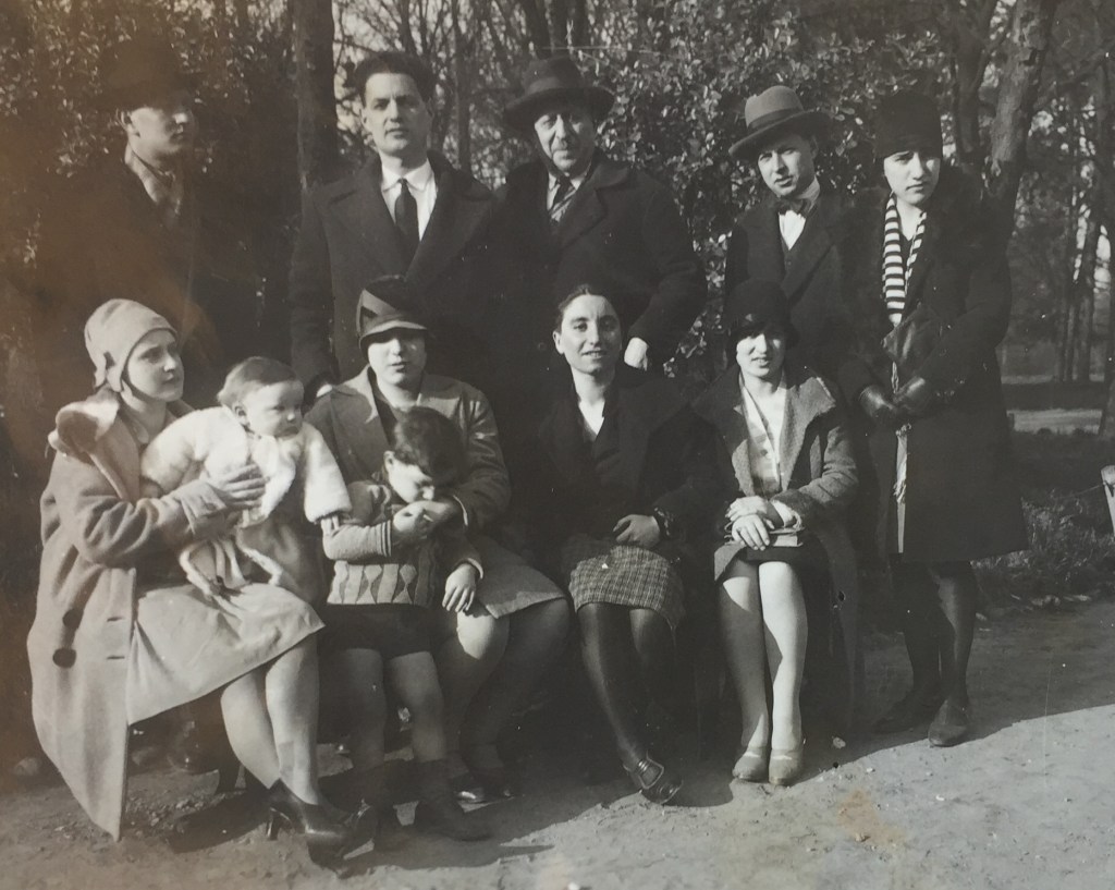 Foto di gruppo in un giardino pubblico milanese per le cognate di Giuseppe Barcellona, Marta e Luisa, con la propria famiglia di origine siciliana. Le tre donne non identificate potrebbero essere le tre sorelle minori di Giuseppe (Maria, Ester, Aurora), e/o le fidanzate/mogli dei suoi due fratelli.