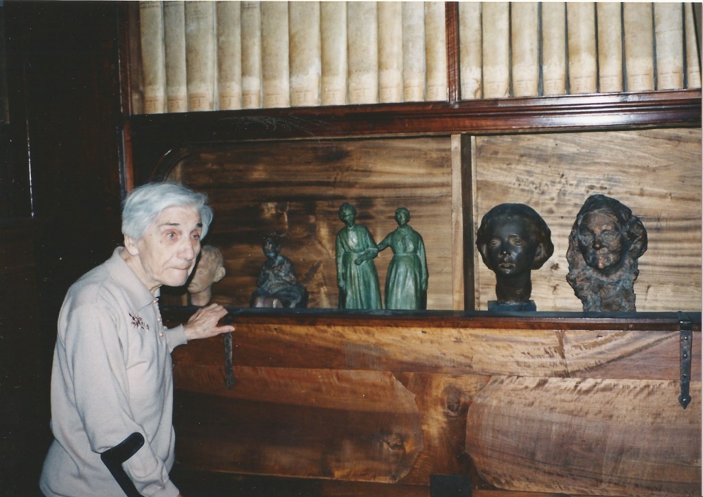 Un’anziana Marta Boccalini posa davanti ad alcune sculture di Ettore Archinti (fra cui si riconoscono le figuree femminili di Forse è meglio che tu non veda), nella Sala dei Filippini della Biblioteca Laudense, durante la sua ultima visita alla città natale (su cui vd. lo speciale Marta torna a Lodi).