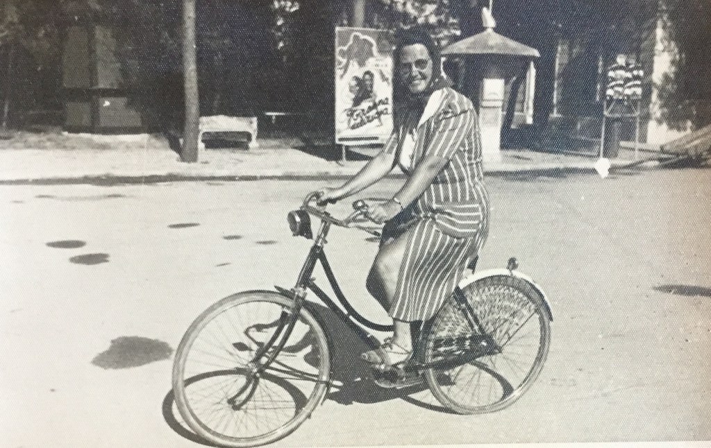Giovanna Boccalini Barcellona alla guida di una bici da donna, in una località di mare (come si capisce dal suo abbigliamento).