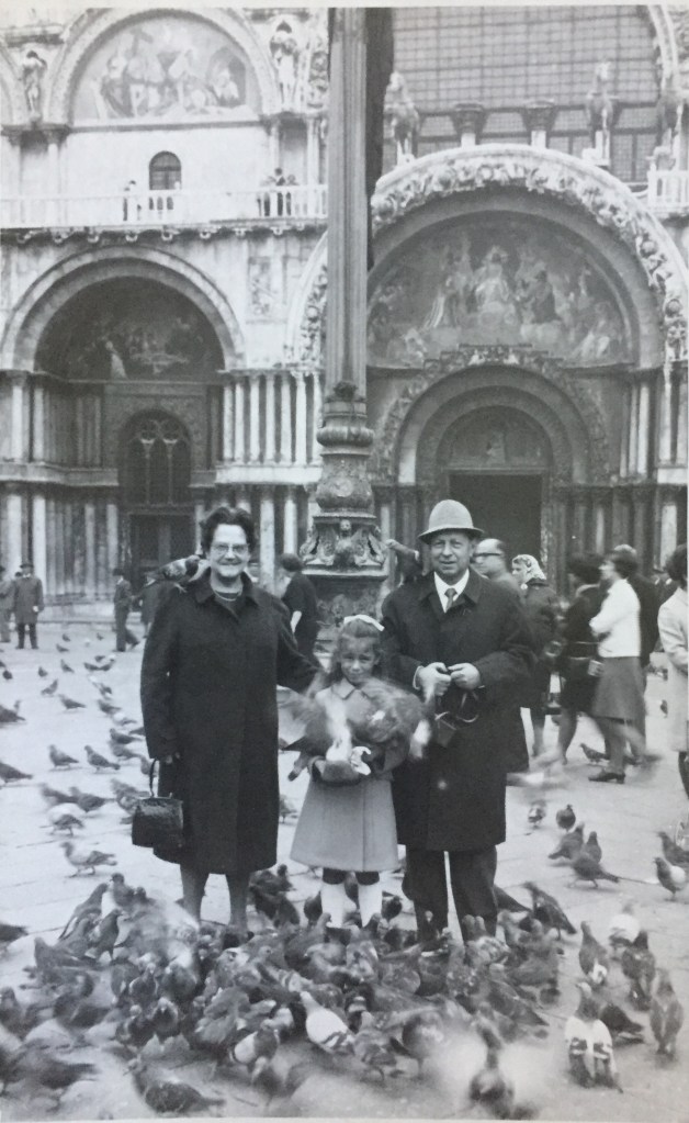 Giovanna Boccalini Barcellona e il marito Giuseppe Barcellona con la nipotina Cristina Ferrari (n. 1962) … e un sacco di piccioni, davanti all’ingresso della Basilica di S. Marco.