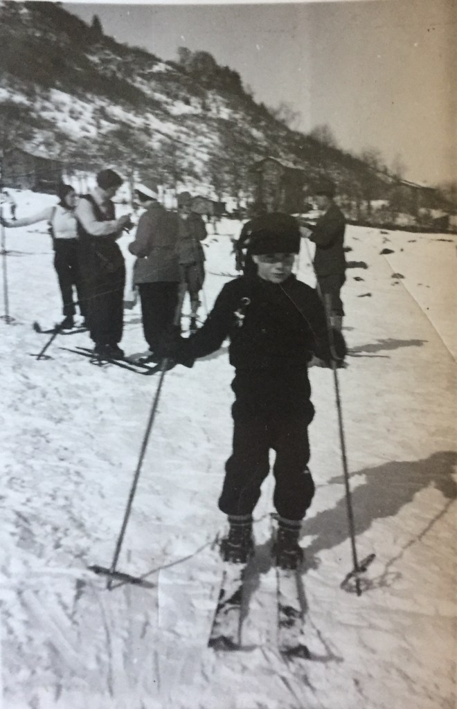 Il piccolo Giacomo Barcellona (5 anni), in completo sportivo scuro, impara a sciare. Sullo sfondo, gli adulti che si vedono in un’altra foto scattata da Pian Rancio.