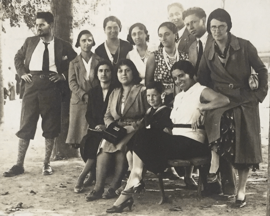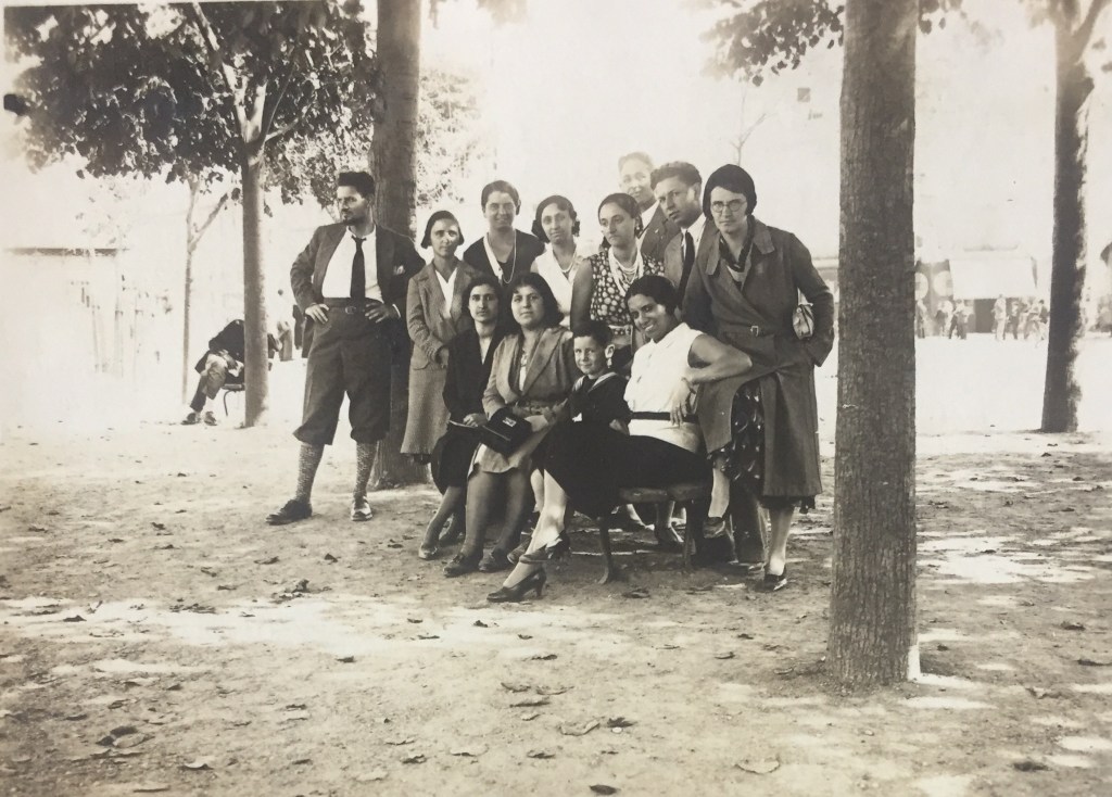 Teresa Boccalini (2° da sinistra, in piedi), Giuseppe Barcellona (2° da destra, in piedi) e Giovanna Barcellona (1° da destra, in piedi, con giacca, occhiali e cappello) assieme ad un gruppo di amici: il 1° in piedi da sinistra è l’amico col pizzetto. Sulla panchina, seduto, è Giacomo Barcellona, vestito da marinaretto.