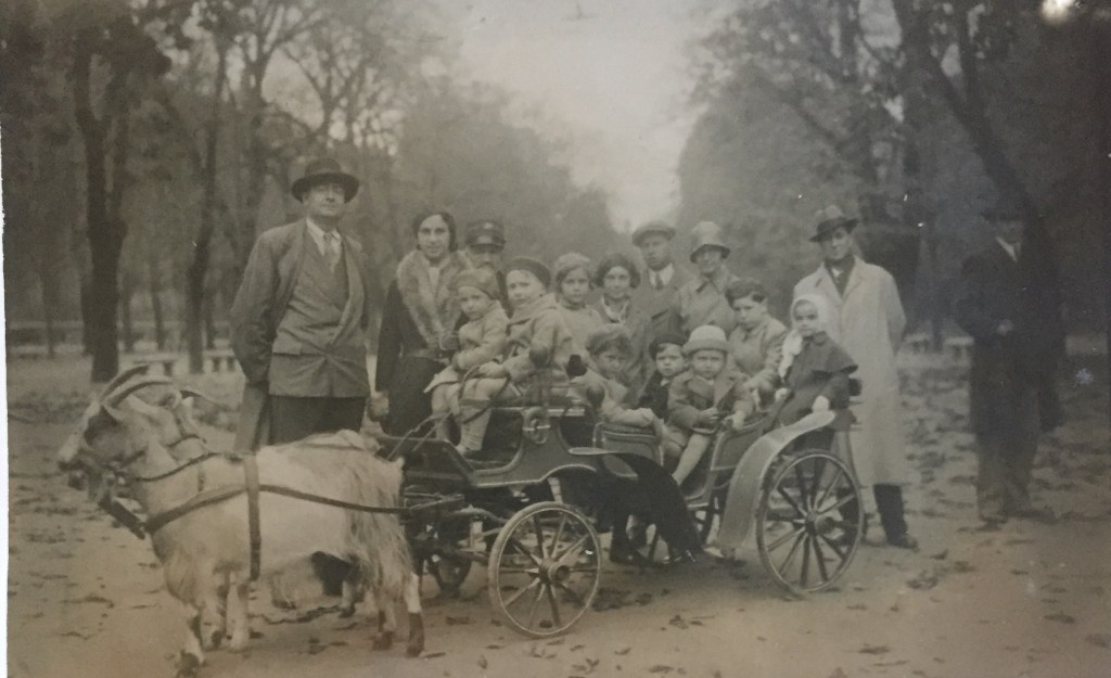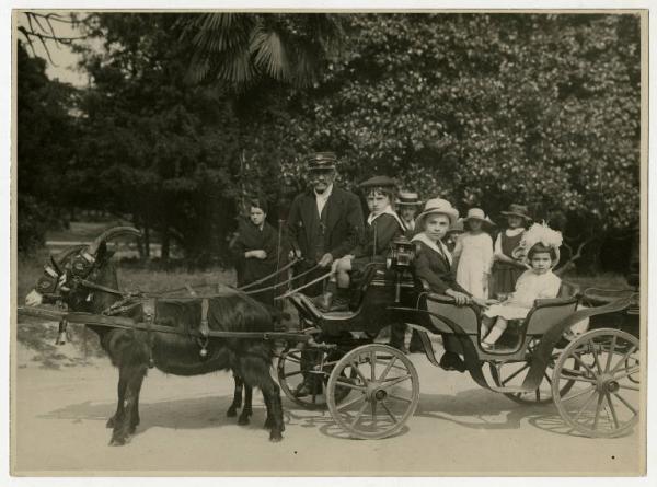 Giacomo (4 anni) e Grazia (1 anno, con cuffietta bianca) in fondo ad una carrozza per bambini trainata da una coppia di caprette, all’interno dei Giardini Pubblici di Porta Venezia a Milano. Alle loro spalle, i genitori Giuseppe Barcellona (basco, camicia e cravatta) e Giovanna Boccalini Barcellona (occhiali e cappello). La terza persona adulta in piedi, coi baffi, è quello che, data la divisa, pare fosse il conducente …
