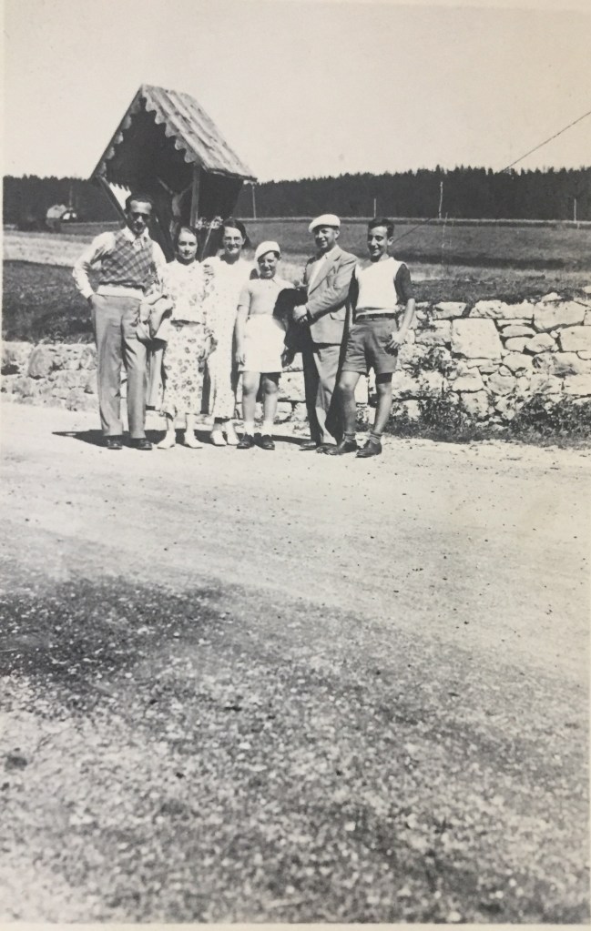 Giovanna Boccalini Barcellona (3°), Giacomo Barcellona (4°) e Giuseppe Barcellona (5°) in posa davanti ad una cappella alpina, assieme ad una famiglia di amici, durante quella che pare essere stata – almeno a giudicare dalle calzature – una semplice passeggiata in pianura.