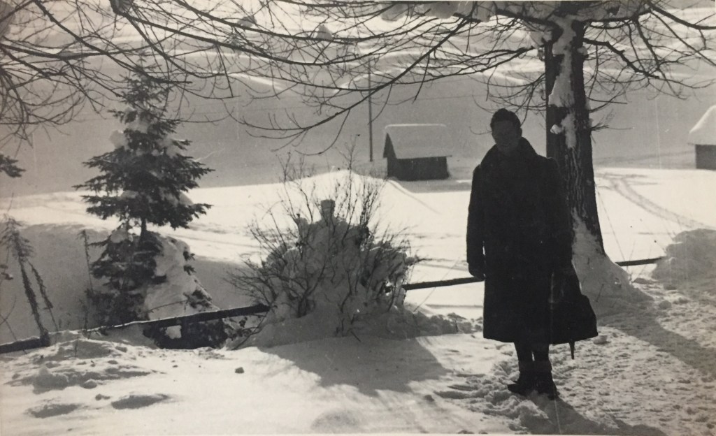 Giovanna Boccalini Barcellona passeggia in mezzo ad un paesaggio innevato, in una località di montagna.