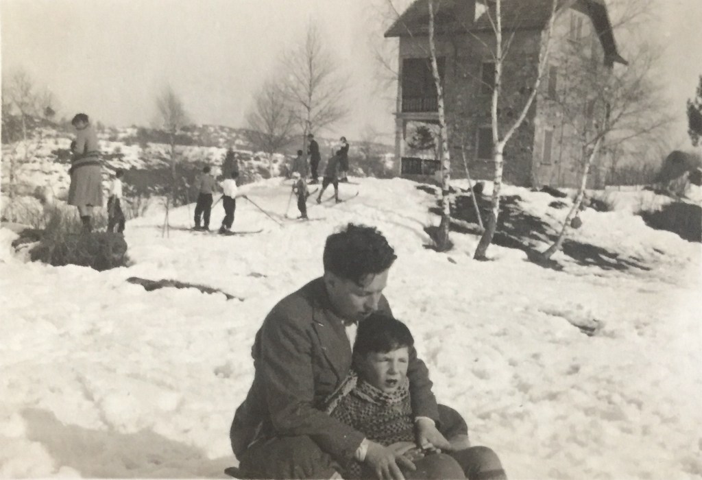 Giuseppe Barcellona e il figlio Giacomo a Pian Rancio: sono vestiti esattamente come in un’altra foto di gruppo. Sullo sfondo, amici ed amiche sciano.