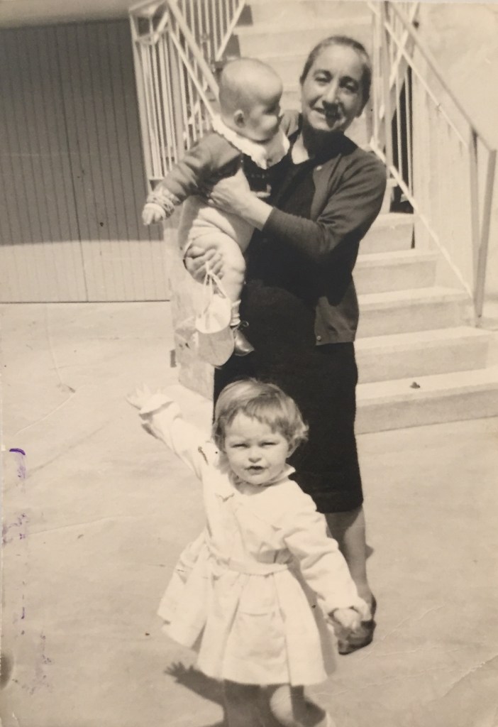 Luisa Boccalini coi due figli di sua figlia Gioia: in braccio Marco Bonitta (n. 1963), ai suoi piedi Silvia Bonitta (n. 1962). Vista l’età apparente dei due bambini, dovremmo trovarci nel 1963, o nel 1964.