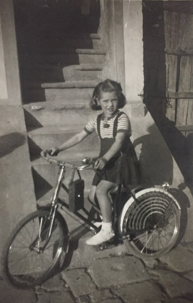 Una bambina (non identificata), in sella alla sua bicicletta.