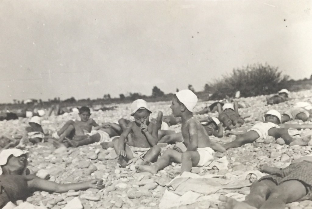 Giacomo Barcellona ed un amichetto (Pepi) svegli, in mezzo agli altri bambini della Colonia Igea, durante il momento del sonnellino, o durante un’attività elioterapica. Il retro della foto ci fornisce alcuni elementi: