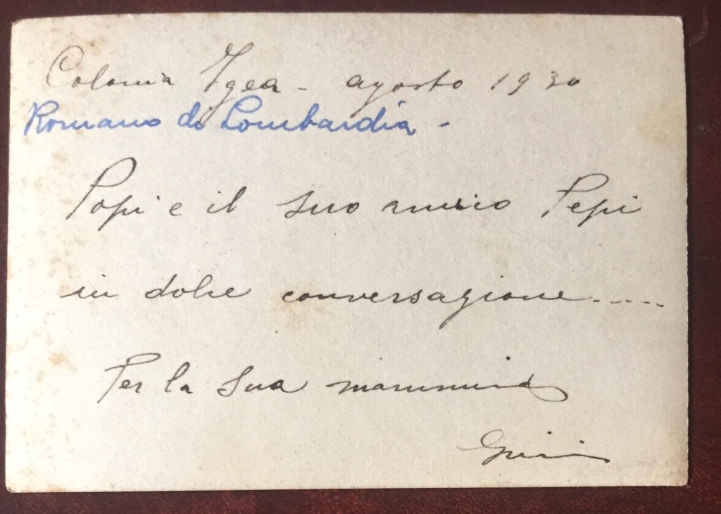 Didascalia sul retro: “Colonia Igea – agosto 1930 | Popi e il suo amico Pepi in dolce conversazione … | Per la sua mammina | G[…]”. Una sovrascritta in blu aggiunge “Romano di Lombardia” vicino a <Colonia Igea>.
