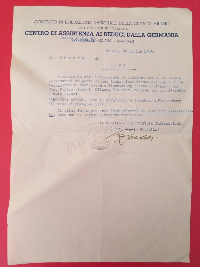 Gli archivi personali delle sorelle Boccalini mostrano le tracce della disperata e tenace ricerca di informazioni circa la sorte del grande amico di famiglia Ettore Archinti, catturato in quanto anti-fascista nel 1944, deportato nel campo di concentramento di Flossenbürg, da cui non tornò mai più, come annunciato dalla Sezione di Lodi della Pontificia Commissione Assistenza:
