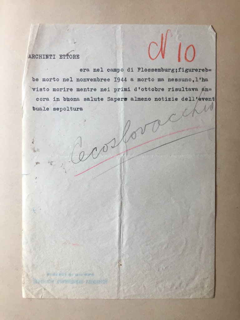 L’aggiunta manoscritta “Cecoslovacchia” è dovuta al fatto che la cittadina tedesca di Flossenbürg si trovava al confine di stato (oggi con la Repubblica Ceca).