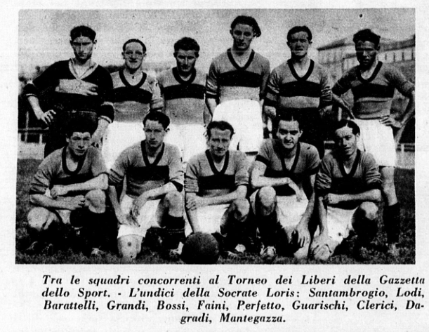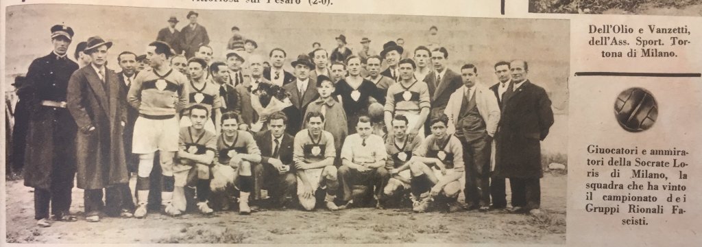 In secondo luogo, in #2, fotografia tratta da Il Calcio Illustrato di mercoledì 10 maggio 1933, la squadra ha appena vinto la finale del Campionato milanese dei Gruppi Rionali Fascisti. Tale data, lo stesso giorno in cui si bruciavano i libri a Bebelplatz, lascia presumere che la gara si sia svolta la domenica precedente, giorno 7. La fotografia, riferendosi ad una finale, dovrebbe essere stata scattata in un campo neutro, piuttosto che in quello di casa del “Socrate Loris” ed ha uno sfondo indefinito: quindi la ricerca parte senza l’ausilio di alcuna immagine fotografica che colleghi la squadra ad un campo di gioco anche solo minimamente riconoscibile.