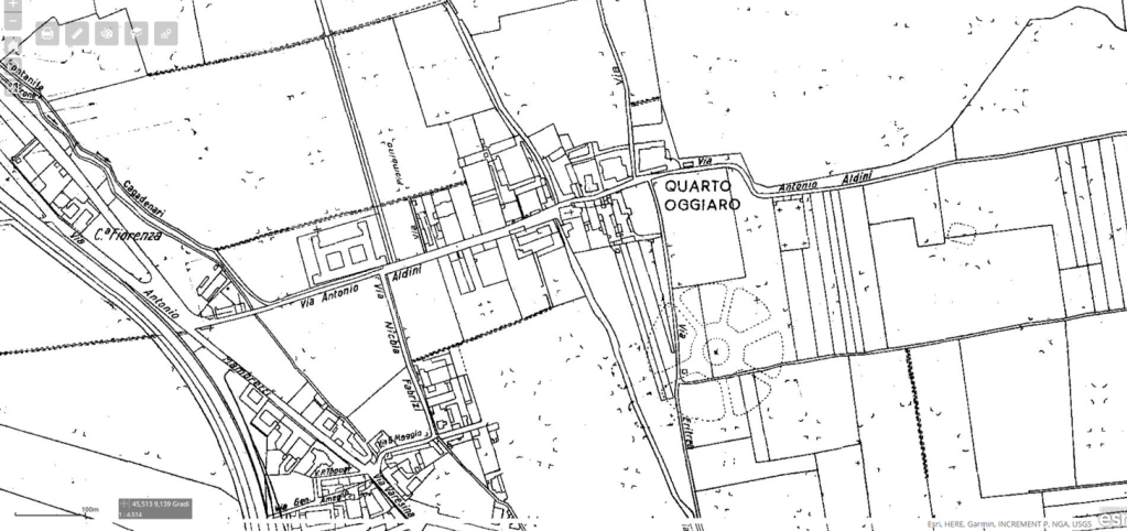 Se la sede del Gruppo era a Musocco, nel vecchio Municipio, dov’era il campo? Il primo risultato ottenuto attraverso i motori di ricerca digitando Loris Socrate porta alla pagina del CDA Villapizzone, dove un vecchio ex giocatore (Franco Colombo) affonda i suoi ricordi nell’anteguerra e cita la rivalità calcistica vissuta negli anni Trenta con squadre della zona, tra cui il Gruppo Loris Socrate. Su una pagina di Skyscrapercity – Milano Sparita è riportato invece un elenco di squadre emanazione dei Gruppi Rionali Fascisti, tra i quali appare un’utile indicazione, che restringe di molto il campo di ricerca: Quarto Oggiaro. L’indicazione è utile sì, ma, per uno standard accettabile di risultato, occorre avere indirizzo, posizione, orientamento e altri elementi univoci di verifica.