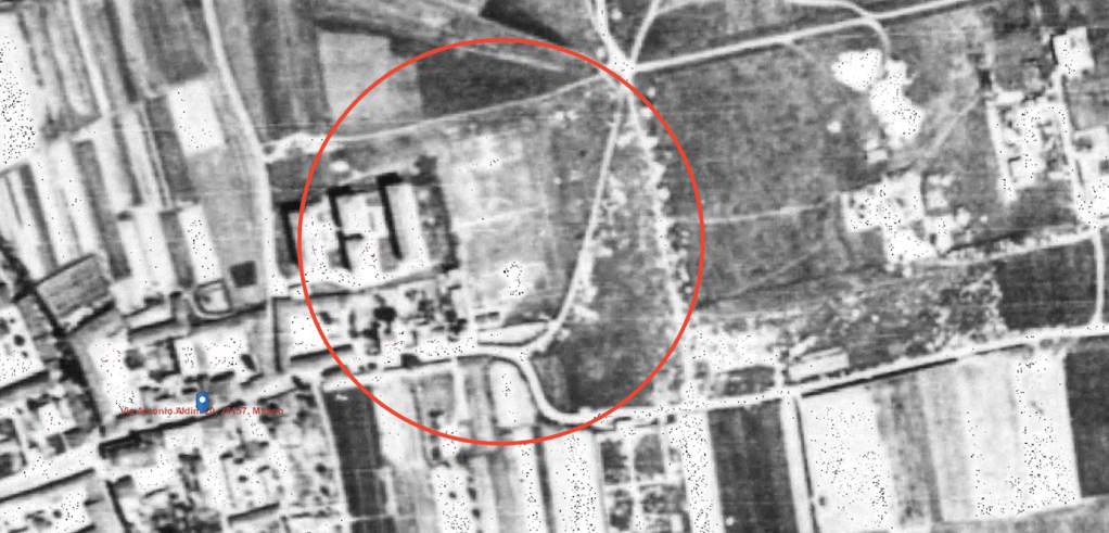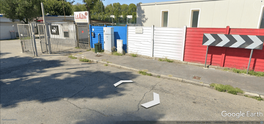 C) L’Aldini, come associazione sportiva, è stata fondata in via Antonio Aldini al 16: prese il nome dalla strada ove fu fondata, attorno alla quale si riduceva all’epoca il quartiere, oppure anche dalla via ove c’era anche il campo? Se l’attuale Aldini, comunque denominata, giocasse oggi in via Aldini al numero 77, ci sarebbero pochi dubbi. Ma, come detto prima, questo campo è stato creato ex-novo nel 2015 e intitolato a Mario Di Marco, ex presidente negli anni Settanta-Ottanta della A.S.D. Sempione Half 1919, squadra che tuttora vi disputa le proprie partite. In quel luogo, per di più, non ci sono tracce di un precedente campo ove l’Aldini abbia potuto giocare prima di trasferirsi in via Orsini. C’era stato forse un altro campo, in via Aldini? Ci viene in aiuto una mappa del Comune di Milano del 1956, (#22) molto interessante in quanto i campi di calcio vi sono indicati con un rettangolo (o anello) tratteggiato: nei pressi dell’attuale numero 2 di via Aldini (abbastanza vicino alla sede, dunque) ve ne è uno, che presenta però una forma leggermente stretta ed appare un po’ troppo incastrato nel contorno urbano… Le misure però sono accettabili per un campo di calcio, l’indizio può essere raccolto e la successiva verifica finale è positiva: ingrandendo l’ortofoto dell’IGMI del 1954 (#23), si riesce ad individuarlo in maniera abbastanza chiara: si riconoscono il contorno e le altre righe del campo, il cerchio di centrocampo e si nota un’usura irregolare, a macchie, diversa dalla inconfondibile livrea spelacchiata dei campi di periferia (e non solo): ciò può accadere quando un campo di gioco dal fondo non ben preparato è anche sede anche di frequenti allenamenti. È in una posizione apparentemente scomoda e senza strutture accessorie ben visibili, ma c’è.