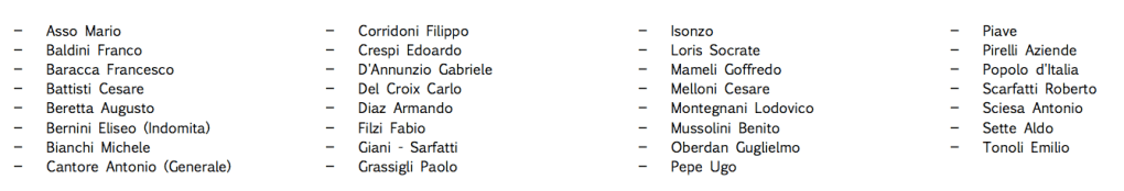 Come si può vedere, i gruppi sono intitolati sia a personaggi storici di primo piano, sia a emeriti sconosciuti. Tredici di loro, squadristi, sono sepolti al Cimitero Maggiore di Milano, al campo 10, ove, come noto, fruiscono di annuale, contestata, commemorazione.
