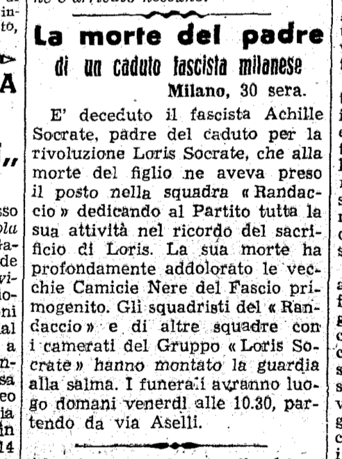 In genere perirono durante o a seguito di “incidenti sul lavoro” mentre compivano violenze a carattere squadristico. Il Gruppo Loris Socrate (#3) aveva sede presso l’ex palazzo municipale di Musocco (#4), in Piazzale Santarosa 10, come testimoniato ad esempio dall’Annuario Giuoco del Calcio del 1932), ed era molto spesso citato, tra i vari giornali, dal Corriere della Sera, sia per le frequenti manifestazioni di regime, sia per i resoconti di eventi sportivi.