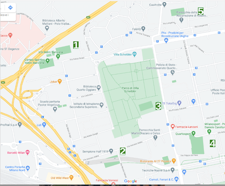 - Campo all’interno del parco di Villa Scheibler – via C. Invernizio angolo via Lessona – 20157 Milano (Oggi con accesso libero e senza recinzioni, conserva però tracce di un passato calcistico “professionale”)