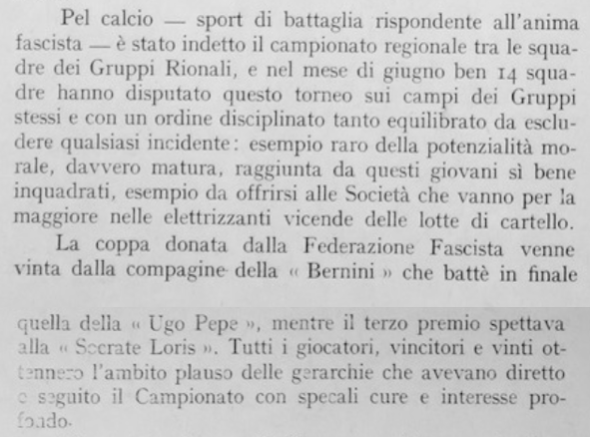 All’epoca era normale che all’interno di ogni Gruppo Rionale Fascista si venissero a formare, col tempo, dei Gruppi Sportivi (particolarmente fiorenti a Milano) che non vanno confusi con il gruppo stesso: così, anche se in molte fonti sportive si parla di “GRF Loris Socrate”, biosgnerà sempre intendere come “Gruppo Sportivo del GRF Loris Socrate”, la cui attività principale era il calcio: sappiamo ad esempio che nell’estate del 1930 la squadra arrivò terza nel campionato regionale dei Gruppi Rionali Fascisti (#6).