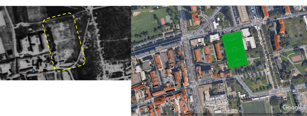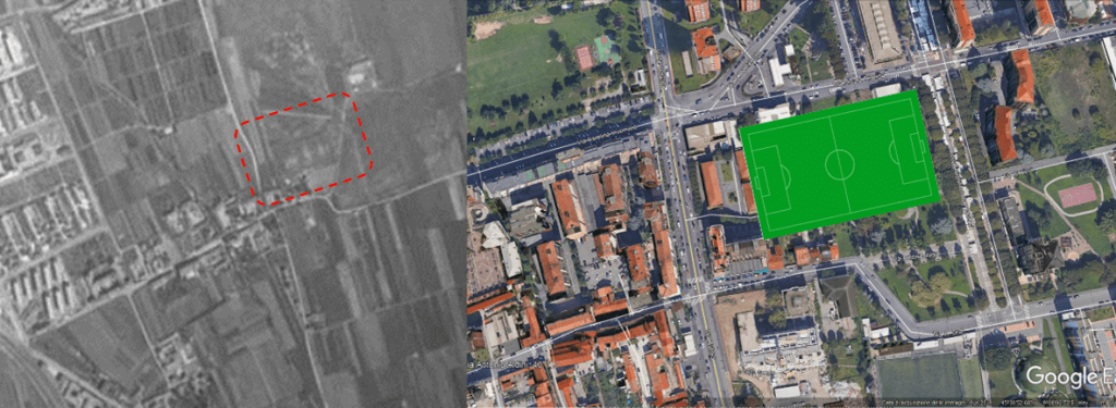 Nel 1933 il campo era dunque lì, di dimensioni visibilmente modeste, in via Aldini al civico 2, (#22 e #23)? Sì e no: la via era quella, il numero civico quello, ma, ad una successiva verifica con una antecedente ortofoto del 1950 (#28), il campo compare adiacente alla sua posizione del 1954, ma ruotato di novanta gradi, più ampio e dal consumo più regolare. Probabilmente fu spostato nella nuova posizione, e visibilmente ridimensionato, dopo il 1950, per consentire la costruzione delle casette sulla sinistra dell’isolato, posizione dalla quale sarebbe stato poi ancora sradicato per essere trasferito, come abbiamo già visto, in via Felice Orsini, dove lo troviamo ancora oggi (sorte di tante squadre milanesi, che si videro il campo cancellato dalla cementificazione urbana e che furono spinte a giocare sempre più in periferia e anche oltre). Questa valutazione rende più plausibile, al di là del contenuto politico del sopruso, il fatto che il GRF Socrate lo avesse preso di mira. L’immagine #29 documenta forse i lavori di quel trasferimento, mentre nelle successive composizioni #30 e #31 le due ortofoto sono affiancate dalle corrispondenti trasposizioni odierne del campo.