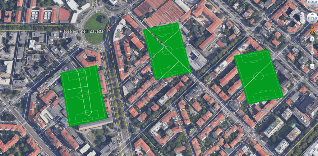 Tornando al nostro campo di piazza Zavattari, la sua presenza e la sua esatta ubicazione senza alcuna approssimazione planimetrica sono perfettamente riportate nella precisa mappa del 1937 dell’IGM (#13): il campo è adagiato dietro l’angolo sud ovest della piazza, verso piazza Monte Falterona, di fronte all’azienda, con tanto di tribune a ovest, come confermato da #4.