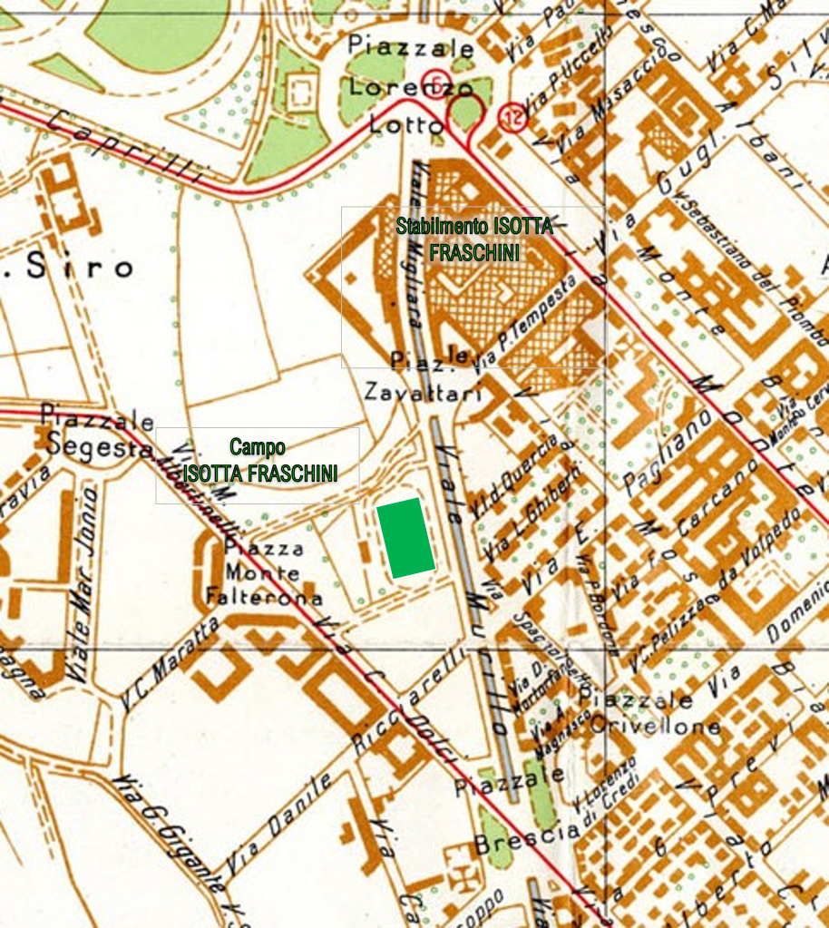 Con assoluta certezza i tabellini dell’epoca identificano e ubicano, associata alla squadra, anche l’esistenza del campo Isotta Fraschini, spesso denominato “Campo Zavattari”: quindi non ci sono dubbi che quel campo esistesse lì, su quella piazza, negli anni Trenta. Nonostante la disponibilità di un proprio campo, risulta da altri tabellini che la squadra dell’Isotta Fraschini abbia giocato anche sul campo di via Candiani (solitamente usato dall’A.C. Stelvio) e sul campo di via Imbonati, a Dergano, forse anche perché il proprio campo veniva utilizzato anche da altre squadre, come quella della vicina De Angeli Frua, che nel 1937, per esempio, partecipava al girone D della Prima Divisione, allora quarto livello dei campionati di calcio nazionali o locali. Secondo Stefano Pozzoni (che conferma il loro utilizzo del campo dell’Isotta Fraschini), i giocatori del Dopolavoro De Angeli Frua indossavano una maglia verde con striscia nera.