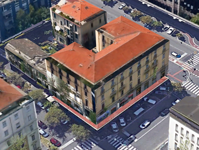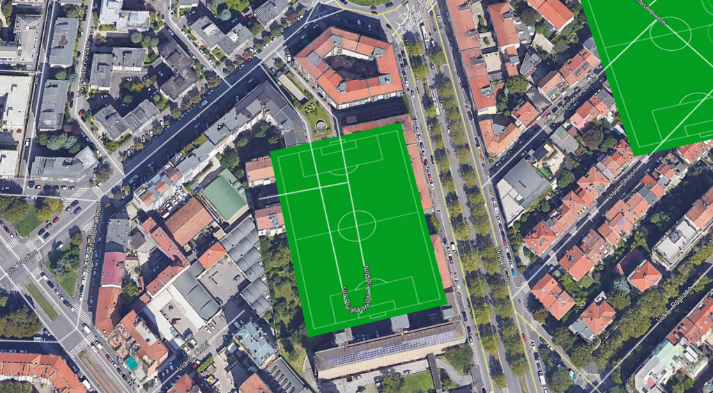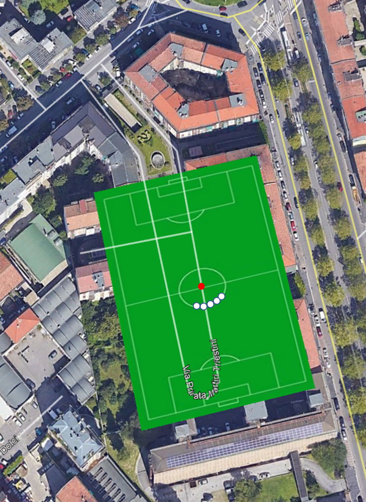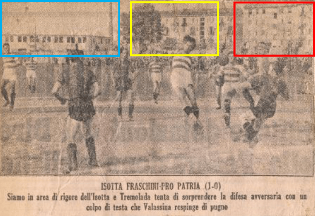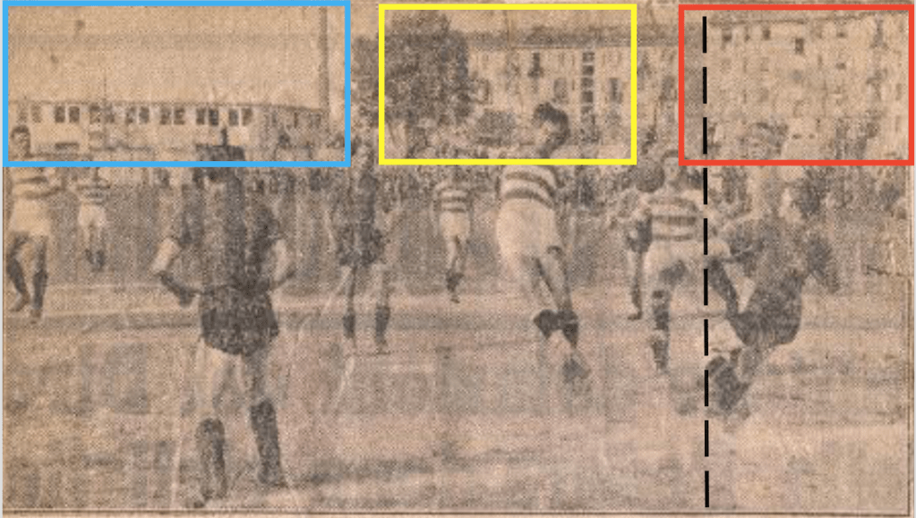 Come ulteriore conferma dell’ubicazione sufficientemente precisa del campo di gioco, al netto di pista di atletica e tribuna, nella foto #30 (elaborazione di #19), la linea tratteggiata nera è la prosecuzione dell’allineamento dei limiti verticali delle sagome dei palazzi di via Mosè Bianchi 103 e 95 (non tragga in inganno il fatto che essa appaia verticale) che si avvicina all’obbiettivo intersecando al centro, o quasi, visto dove di trova il portiere, la linea dell’area di porta. Per una maggiore comprensione si veda #31, ove tale linea è riportata in pianta.