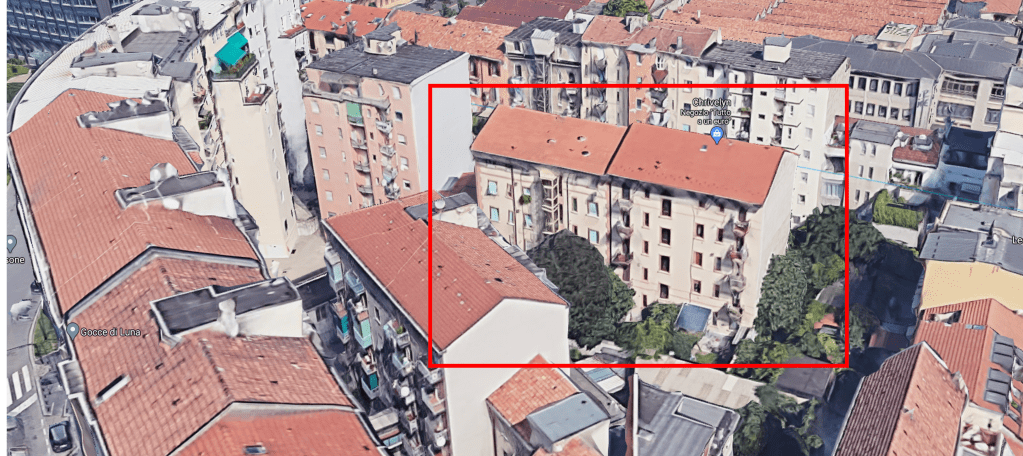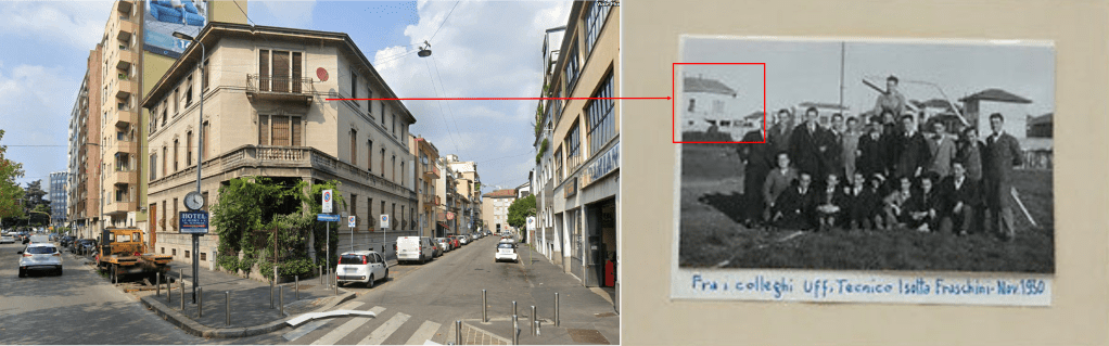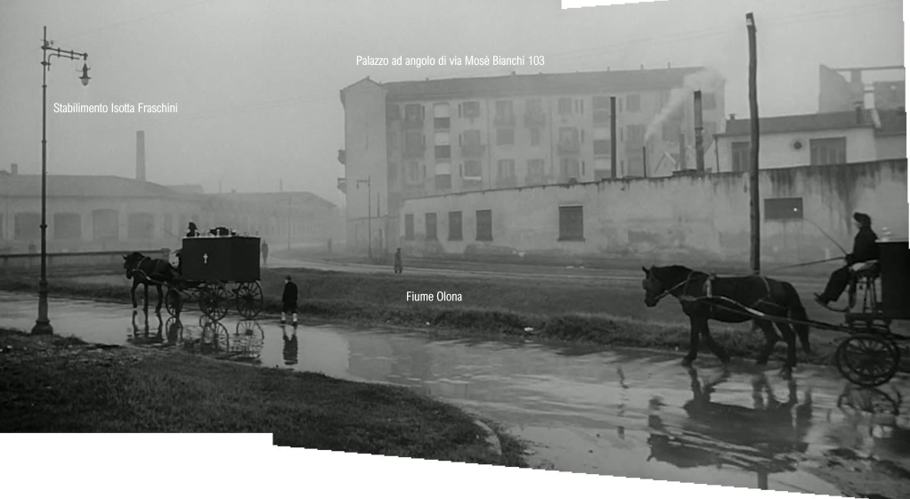 Grazie a #21 riconosciamo infatti sullo sfondo: uno scorcio dello stabilimento, con ciminiera (riquadro azzurro); il più volte citato palazzo di via Mosè Bianchi 103 (riquadro giallo); un nuovo elemento di riscontro (riquadro rosso), ossia una coppia di edifici adiacenti, riconoscibile oggi nell’immagine #22 e con presumibile ingresso dal numero 95 della stessa via.