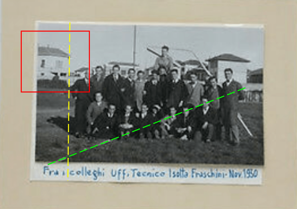 Per quanto riguarda la ricerca di possibili riscontri fotografici ricavabili delle fotografie, non c’è molto materiale su cui poter lavorare, in quanto si intravvede soltanto, senza poterla riconoscere con esattezza, una costruzione, bassa, non ampia, apparentemente complessa,che non fornisce ulteriori elementi di riscontro, se non una certa compatibilità di posizione con quella costruzione dai “muri bianchi” mostrata in #32 dal lato opposto, e nulla toglie all’esito complessivo di tutti gli altri, compresi quelli che seguono.