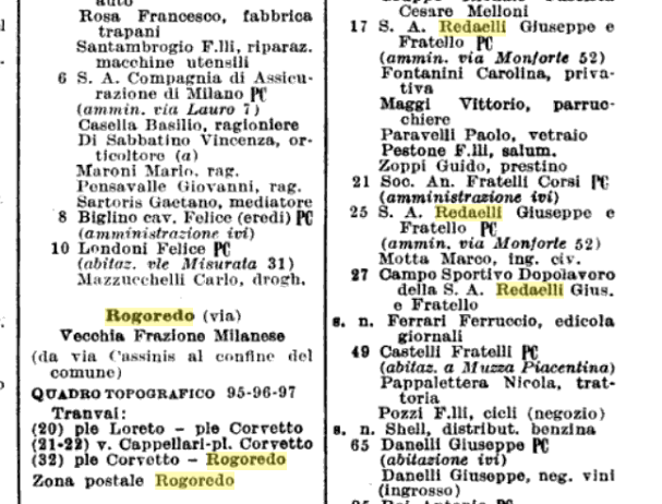 Il campo sportivo apparteneva alla S.A. Gius. e F.llo Redaelli, normalmente chiamata anche “Redaelli”, “Ferriera Redaelli” o semplicemente, per gli abitanti della zona, “La Redaelli”, che lo aveva allestito per il proprio dopolavoro aziendale all’interno del perimetro dello stabilimento all’inizio degli anni Trenta, tra ciminiere fumanti e capannoni rumorosi. La Guida Savallo lo riporta nell’edizione del 1939 (#3) all’indirizzo di via Rogoredo 27, dove c’era un’entrata al campo indipendente da quelle allo stabilimento, funzionale ad un accesso appropriato alle squadre ed al pubblico (#4, #5 e #6), un particolare che troviamo in tutti i frequenti casi di campi allora situati all’interno delle fabbriche, ancorché probabilmente previsto dall’ordinamento calcistico. Oggi quell’entrata è ancora perfettamente riconoscibile e confrontabile con le mappe degli anni Trenta (#7).