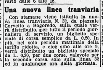 Il quadretto di Tessa è interessante perché ci testimonia prima di tutto che nel 1937 la tariffa del tram “speciale” per Corvetto era ancora ferma a 10 centesimi, un prezzo evidentemente ancora basso rispetto al solito. Nel trafiletto giornalistico (purtroppo non datato) riportato da Mauro Colombo (#55) si dice che il biglietto per una corsa singola del 32 costava 20 centesimi: forse che col tempo l’Azienda avesse abbassato il prezzo, come da tendenza già evidente nella tariffa speciale mattutina (30 centesimi per andata e ritorno)? In ogni caso, Tessa ci testimonia in secondo luogo il fatto che il tram diretto alle “sette piante di Rogoredo” forniva un servizio assolutamente approssimativo.