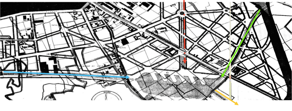 Il Porto era collegato verso ovest con il Naviglio Grande all’altezza della stazione ferroviaria di San Cristoforo secondo un tracciato corrispondente alle odierne vie Antonini, Quaranta, Marco d’Agrate (freccia Azzurra). Verso est il porto era collegato con la Martesana (freccia verde). La grossa direttrice stradale nord-sud da viale Lombardia a viale Basilicata pare progettata appositamente quale via di scorrimento veloce per il porto commerciale (freccia rossa). Le acque erano evidentemente in ingresso sia da est che da ovest, mentre uscivano verso sud (Canale per Lodi) in previsione del futuro collegamento col Po (freccia gialla).