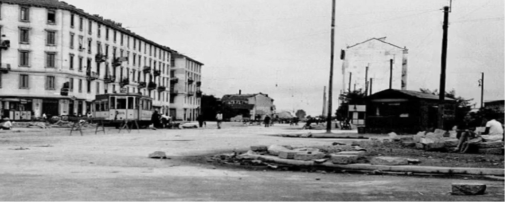 Sullo sfondo, in alto a destra, piazza Gabrio Rosa, con la chiesa di Santa Rita e l’agglomerato di case Quartiere Regina Elena.