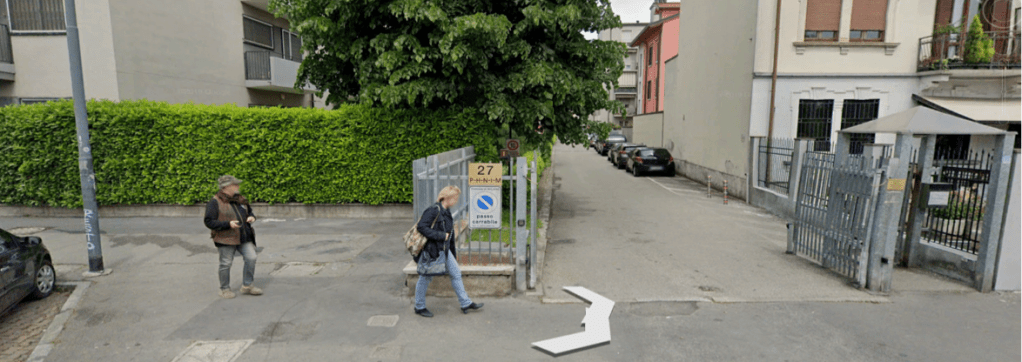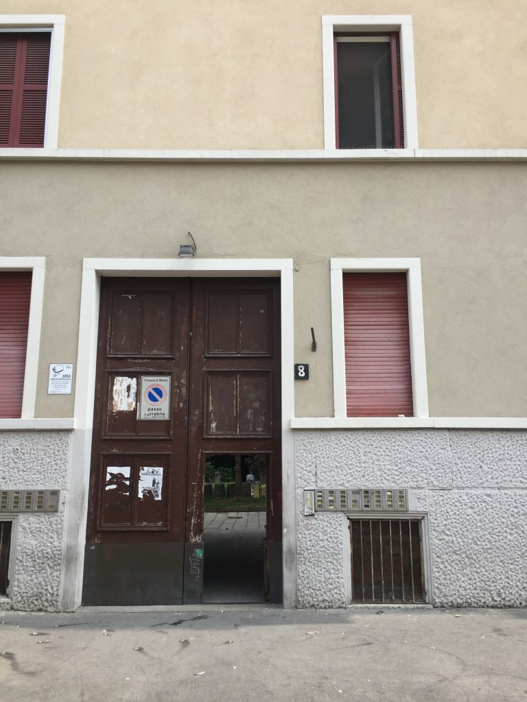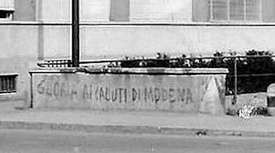 Lo stesso fotografo di #33 ci ha lasciato anche un altro scatto, preso da via Rogoredo (#34), nel quale si legge più chiaramente la scritta sul muretto, ossia: “Gloria ai Caduti di Modena” (#35).