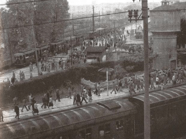 La linea ferroviaria era attraversata dai veicoli stradali, dai pedoni e dalle rotaie del tram a vapore, abbastanza oblique rispetto ad essa da consentirne un’intersezione funzionale.