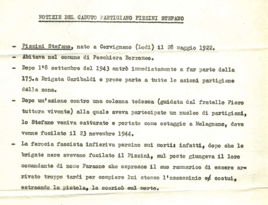 E qui un risultato, quantomeno verosimile, è stato trovato. Come avvenuto appunto nel dopoguerra, infatti, molte squadre e campi di calcio furono intitolate a personaggi locali legati alla lotta di Liberazione , come abbiamo già visto per l’intitolazione a Renzo Novelli del campo di via Aldini. Una ricerca il tal senso ha portato alla luce il nome del partigiano Stefano Pizzini, che era originario di Bettola di Peschiera, vicino a Rogoredo, ove gli echi dell’eccidio che pose fine alla sua esistenza giunsero sicuramente, anche a giudicare dalla documentazione disponibile in proposito (#15 e #16).