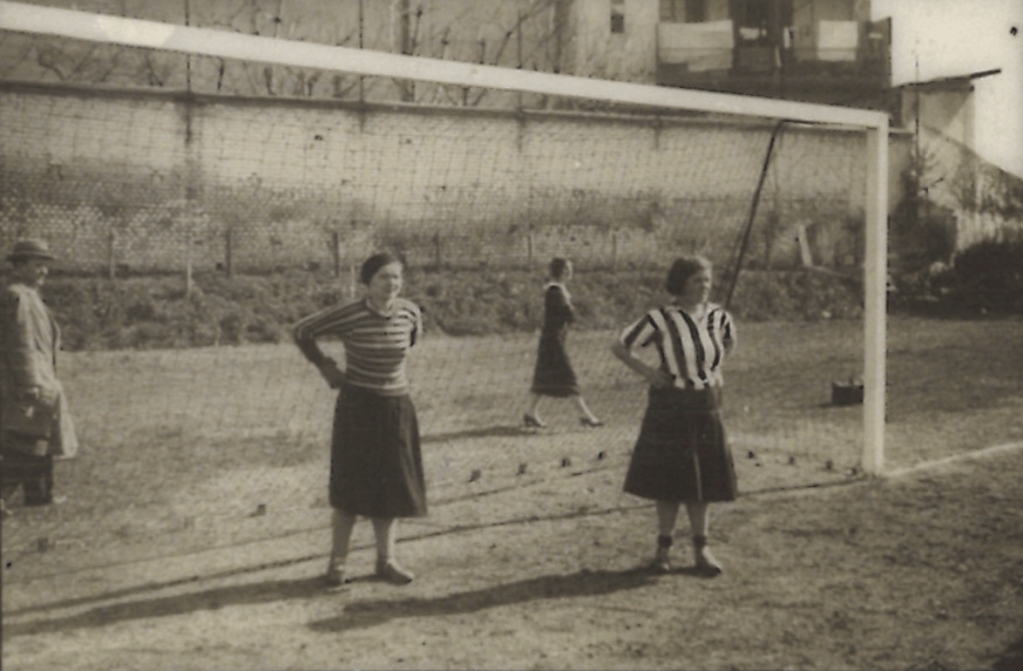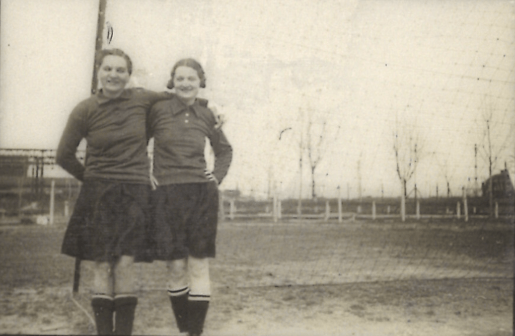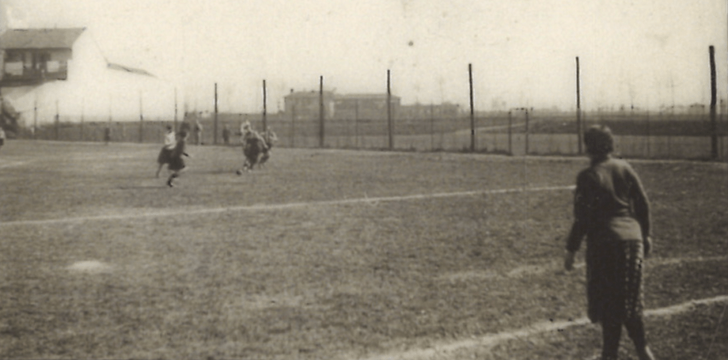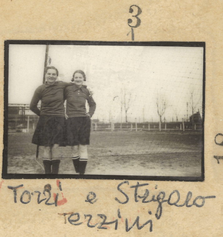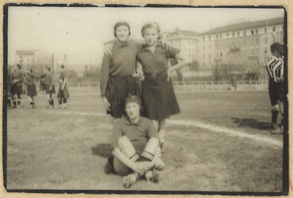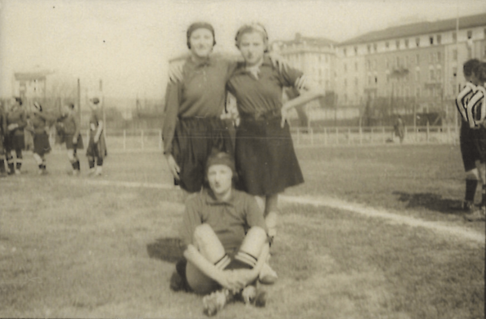 Le due giocatrici posano davanti ad una delle porte che difendono (vd. il sostegno al palo visibile dietro la schiena di Wanda): lo sfondo dovrebbe aiutarci a identificare il campo con quello del Redaelli.