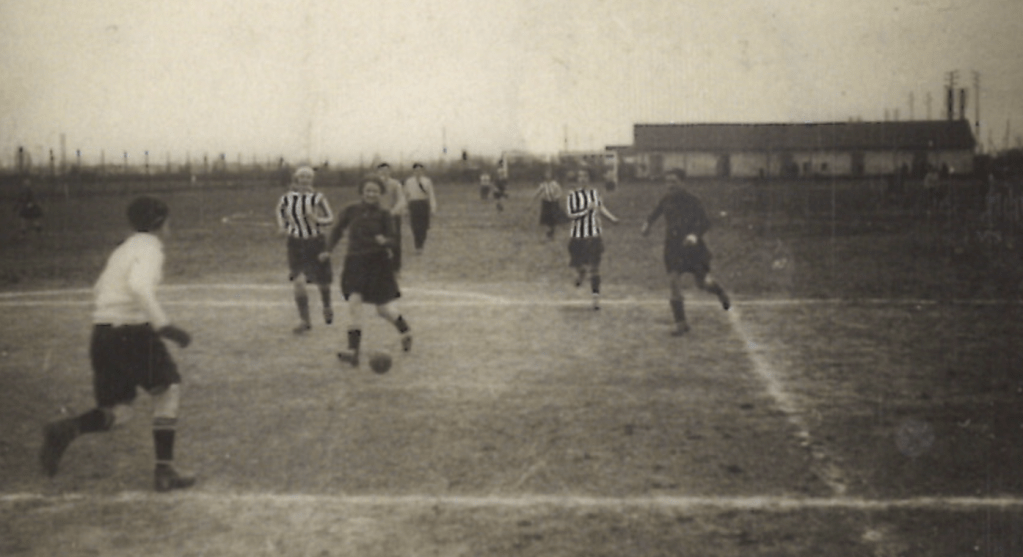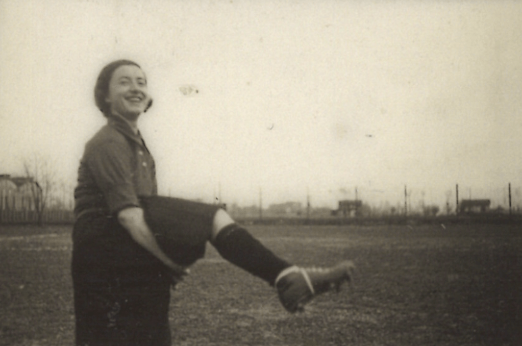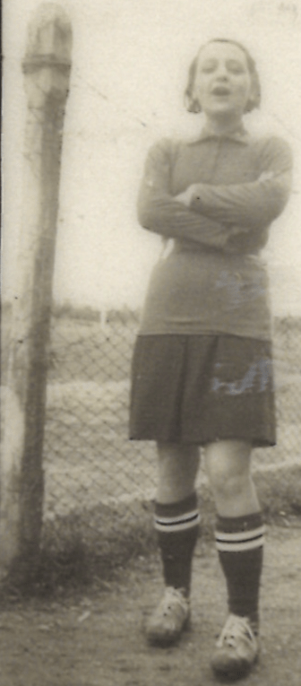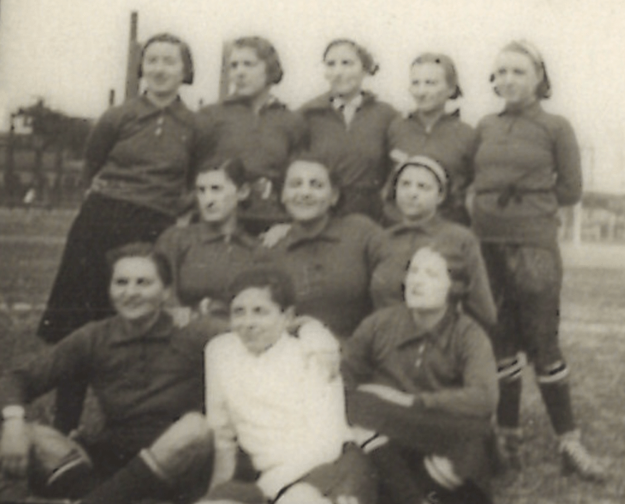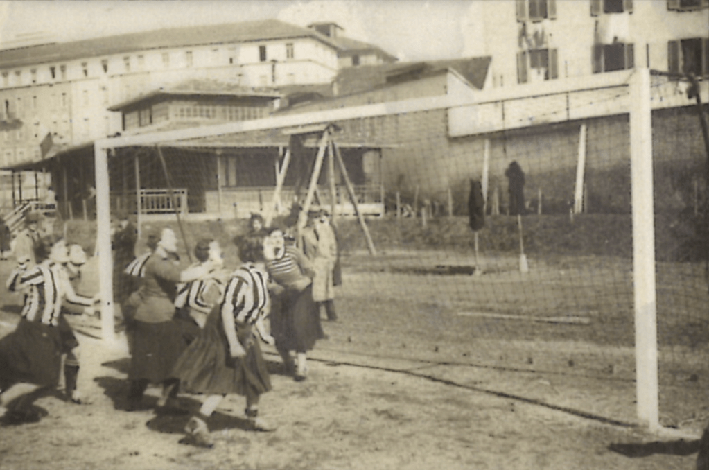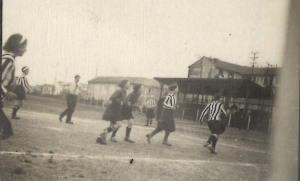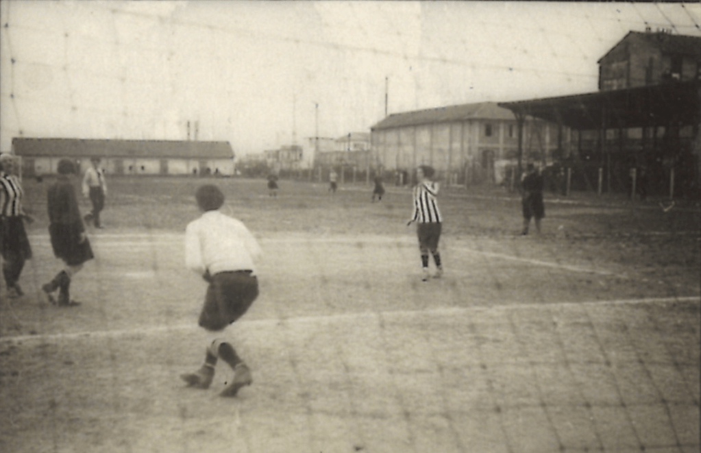 Le due giocatrici posano davanti ad una delle porte che difendono (vd. il sostegno al palo visibile dietro la schiena di Wanda): lo sfondo dovrebbe aiutarci a identificare il campo con quello del Redaelli.