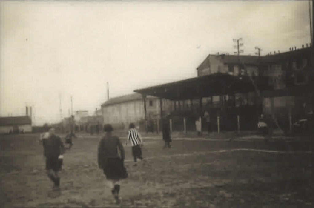 Un’altra azione di gioco, ripresa da dietro la porta (come si nota dal palo a destra) del campo Redaelli. Sulla sinistra si nota chiaramente un uomo in camicia e cravatta: forse l’arbitro, o l’allenatore Piero Cardosi.