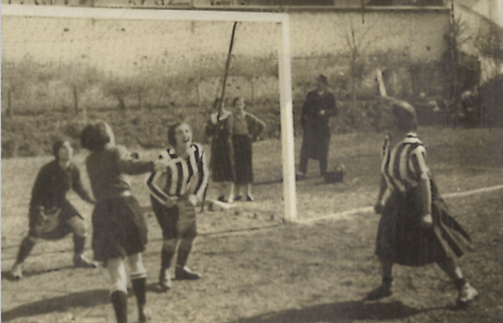Una concitata azione di gioco attorno alla porta delle granata, difesa da Wanda Torri, sul campo DAS di via Tertulliano, di cui possiamo apprezzare il noto villino che fungeva da spogliatoio.