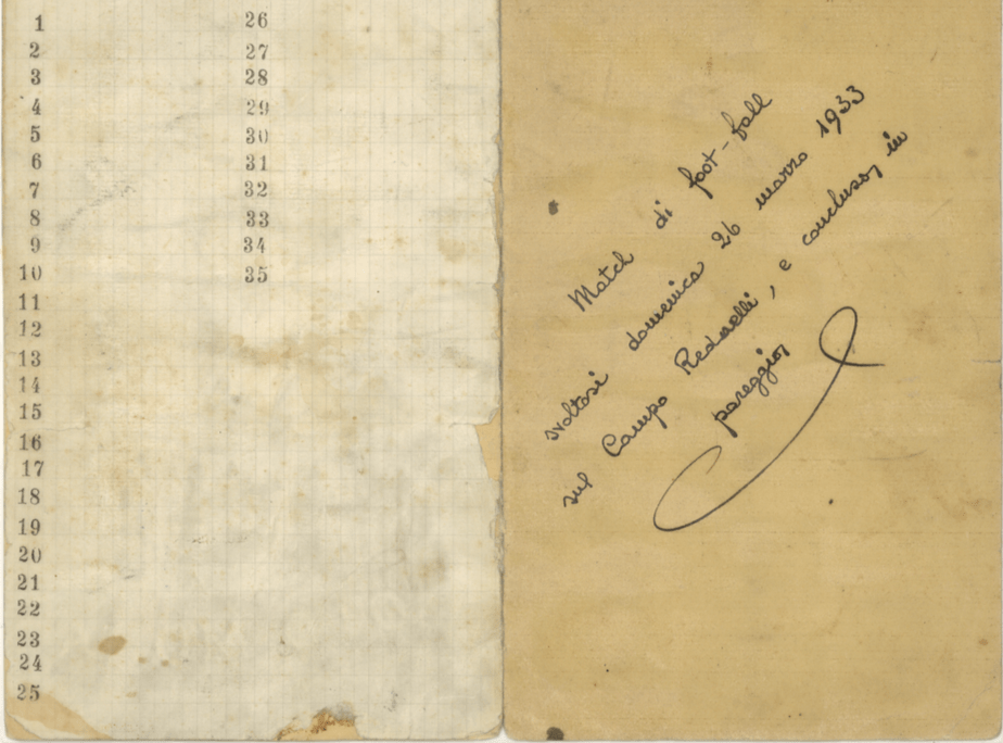Nella pagina di sinistra ci sono 14 provini, in quella di destra 20 – per un errore di numerazione, manca il #25: per questo l’ultimo effettivo è numerato #35 anziché #34, e la serie passa direttamente da #24 a #26. La pagina di sinistra è tutta quanta dedicata alla Squadra rossa (o granata), in cui effettivamente Wanda giocò nelle prime partite, come terzino destro; quella di destra alle diverse fasi del gioco, come denunciato da una scritta a matita rossa.