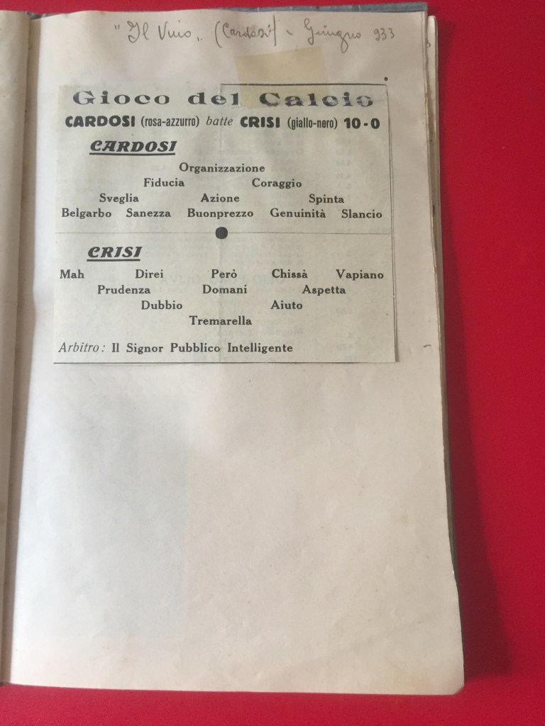 Il quaderno contiene anche un curioso ritaglio collegato a Ugo Cardosi, presidente del GFC e commerciante di vini e vermouth: