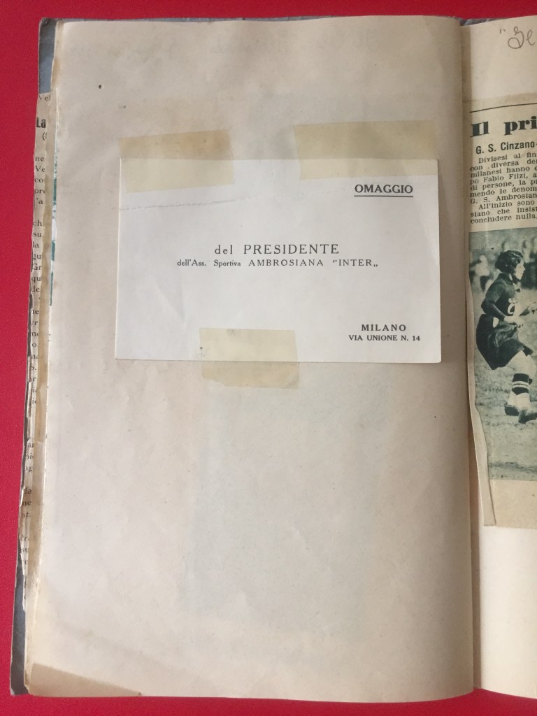 Attaccato a 18v c’è un biglietto “OMAGGIO” del “PRESIDENTE | dell’Ass. Sportiva AMBROSIANA “INTER” “, cioè in quel momento (che sia dell’epoca è provato dall’indirizzo, cioè Via Unione 14, Milano) Fernando Pozzani. Potrebbe anche trattarsi di un biglietto omaggio per una partita dell’Ambrosiana, all’Arena: forse quella cui assistette Rosetta assieme alle sue compagne il 9 luglio 1933? I biglietti furono regalati a Rosetta e compagne dal giocatore dello Sparta Burgr: ma in effetti dovevano essere passati prima dalle mani di qualche dirigente dell’Ambrosiana, che ospitava l’incontro …