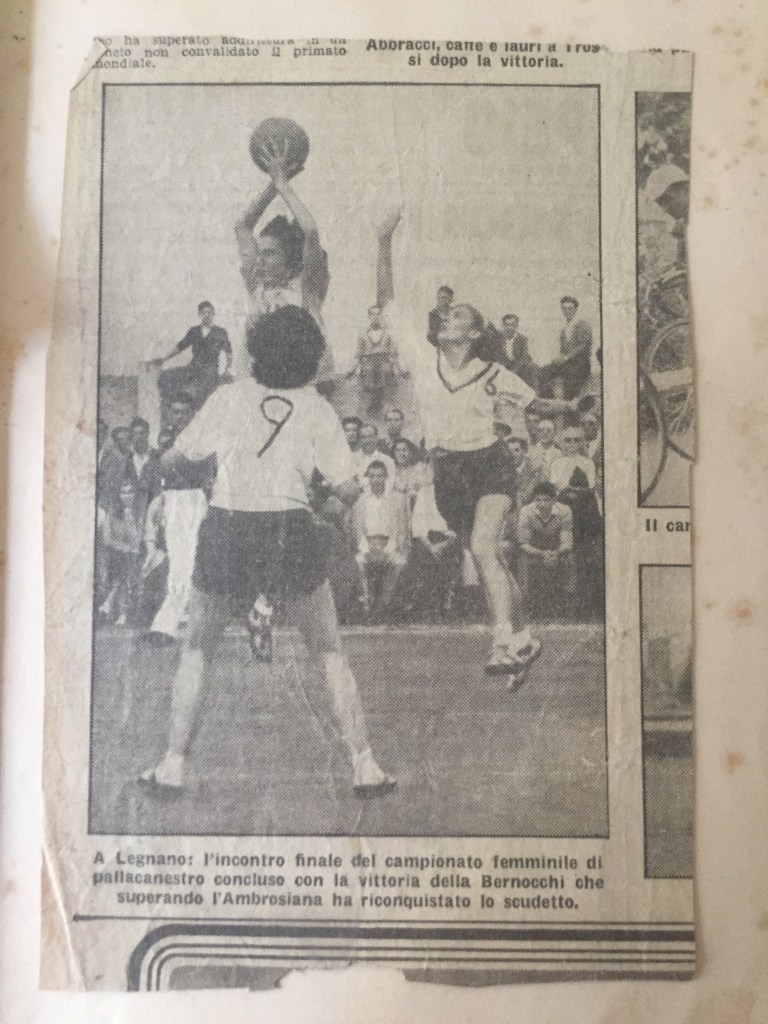Il secondo ritaglio volante ci riporta alla successiva carriera di Rosetta Boccalini: ritrae 3 cestiste, due in maglia bianca, una in maglia leggermente più scura. Non sappiamo né la data né la testata, ma la didascalia ci permette di capire che ci troviamo all’ultima partita del campionato vinto dalla Bernocchi Legnano, che sconfiggendo l’Ambrosiana in campo riconquista il titolo nazionale. Date queste coordinate, dobbiamo per forza di cose trovarci il 4 luglio 1948, sesta ed ultima giornata del girone finale della Serie A femminile: le legnanesi in effetti batterono le milanesi 29 – 14, aggiudicandosi il secondo titolo consecutivo (vd. Mascolo, Massimiliano (ed.) (20162): Almanacco del basket al femminile dal 1924 all’altro ieri. Viterbo: Melting Pot, p. 73).