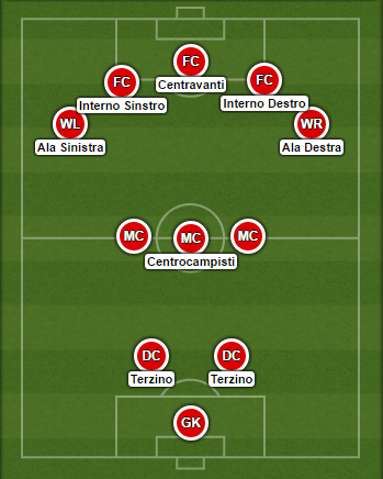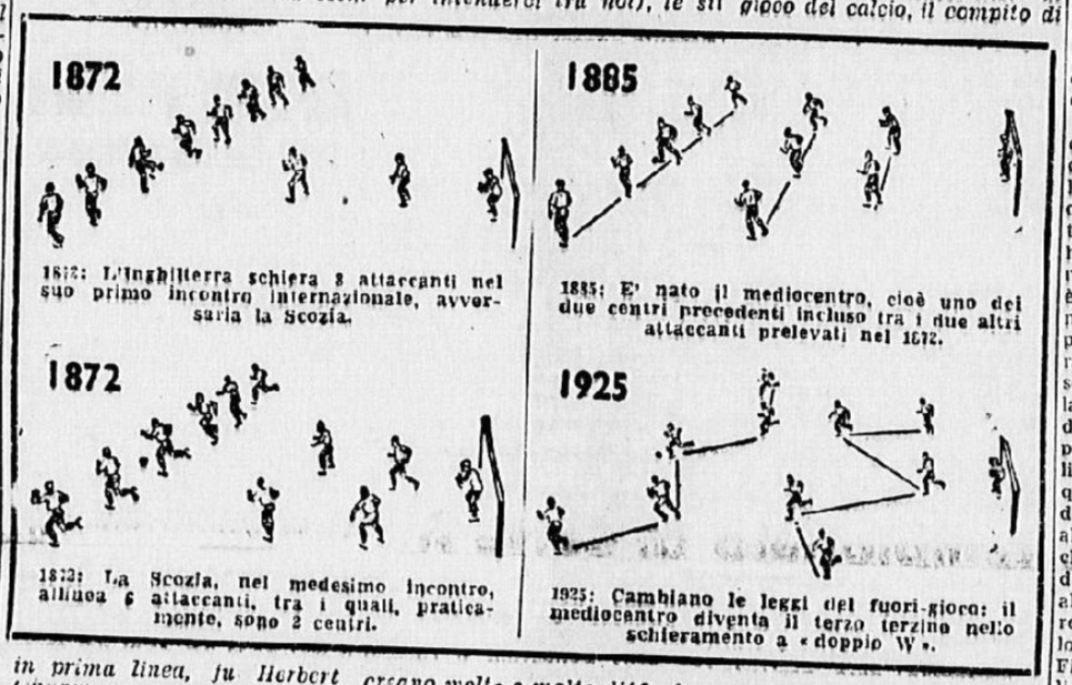 Per comprenderlo, si ricordi il modulo utilizzato dalle squadre calcistiche maschili in quegli anni in Italia, ossia il il Metodo (2-3-2-3), evoluzione della Piramide di Cambridge (2-3-5) – la differenza stava nel fatto che tecnici come Carlo Carcano e Vittorio Pozzo avevano arretrato i due attaccanti attorno al centravanti (le mezz’ali, ossia il n. 10 e il n. 8), trasformandoli in cinghie di trasmissione fra attacco e centrocampo.