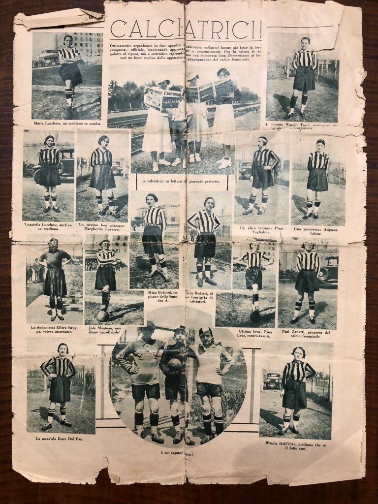 Il pezzo più interessante dell’archivio è sicuramente il paginone de Il Calcio Illustrato dell’estate 1933 contenente la galleria delle calciatrici, che Mina conservò per tutta la sua vita nel portafoglio, piegato in 8, e che venne ritrovato dai familiari dopo il suo decesso. Una testimonianza eloquente di quanto il ricordo di quella esperienza giovanile non abbandonò mai la capitana della Squadra A.