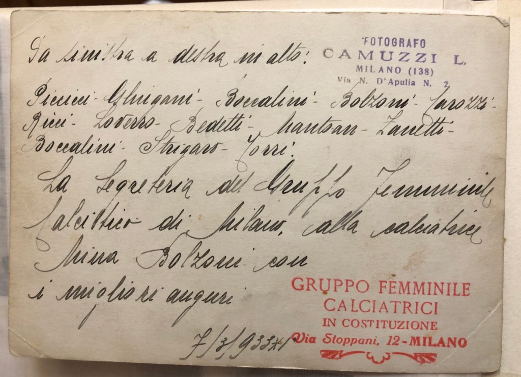 Nel retro sono presenti anche due timbri. Il primo, in inchiostro rosso, è quello del “GRUPPO FEMMINILE | CALCIATRICI | IN COSTITUZIONE | Via Stoppani, 12 – Milano”; il secondo è quello dell’autore della fotografia, cioè il “fotografo | CAMUZZI L. | MILANO (138) | Via N. D’Apulia n. 2”, che possiamo identificare con Luciano Camuzzi, fotografo presente in quegli anni in città assieme al più noto fratello Mauro.