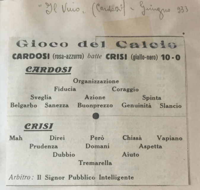 La Ditta Cardosi faceva stampare un foglio informativo, intitolato Il Vino, usato per comunicare le offerte ai clienti: ne troviamo un ritaglio ad ambientazione calcistica datato giugno 1933 nel quaderno del calcio di Rosetta Boccalini.